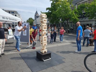 Unser Highlight am Info-Stand: Wir spielen mit den Passanten Demokratie-Jenga. Wenn irgendwann der Demokratie zu viele Bestandteile entnommen worden sind, bricht sie zusammen.
