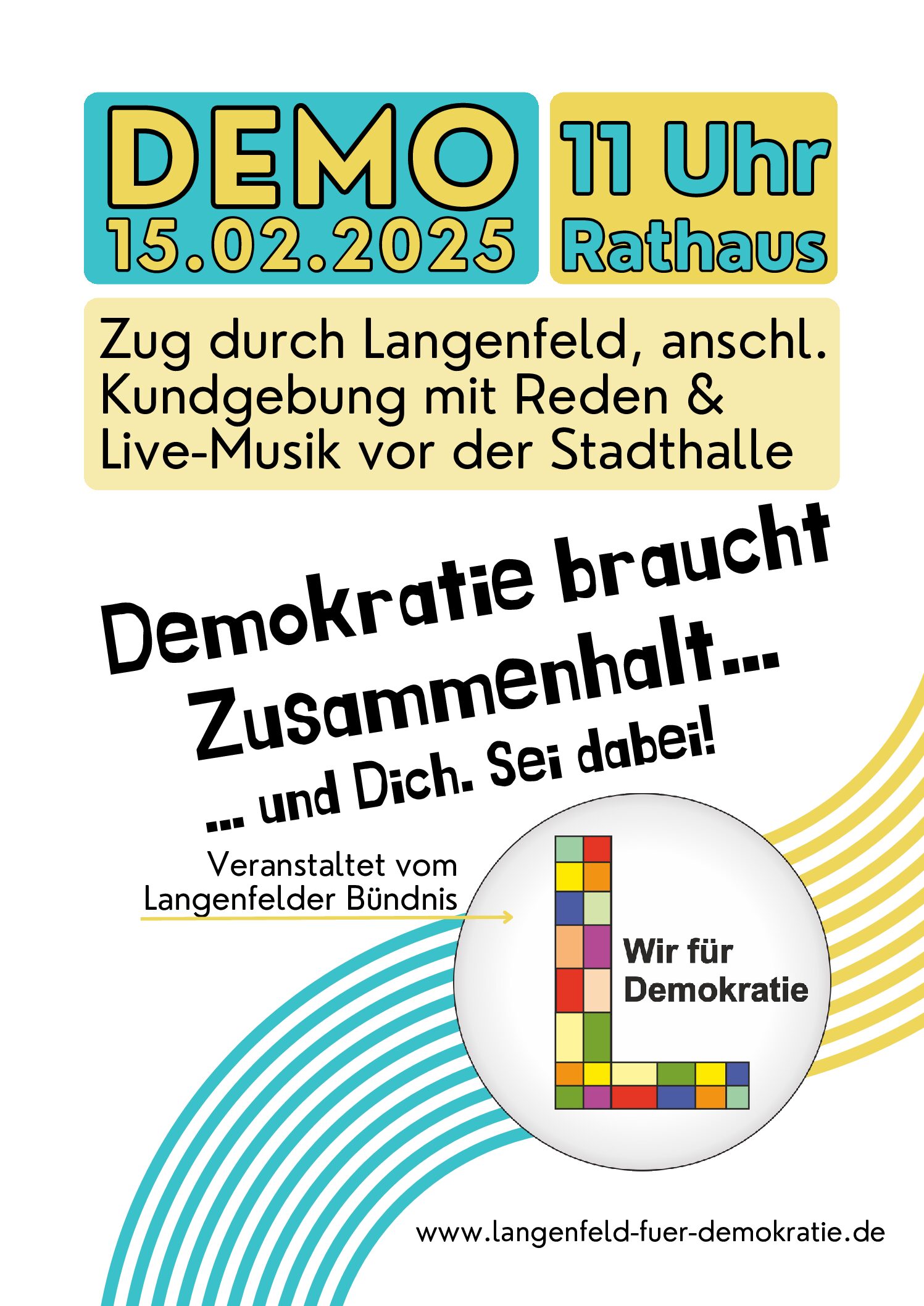 Am Samstag, 15. Februar, ruft das Bündnis „Wir für Demokratie“ zu einer Demonstration unter dem Titel „Demokratie braucht Zusammenhalt“ auf. Seit Januar 2024 ist das Bündnis „Wir für Demokratie“ in Langenfeld aktiv, ein breiter gesellschaftlicher Zusammenschluss aus Vereinen, Wohlfahrtsverbänden, Unternehmen und anderen Institutionen, der seither durch zahlreiche Informationsveranstaltungen, kulturelle Events und andere Aktionen die Aufmerksamkeit auf den Wert unserer Demokratie und einer friedlichen und offenen Gesellschaft richtet. In den vergangenen 12 Monaten ist die Situation nicht einfacher geworden, und unsere Demokratie ist mehr denn je gefährdet. Der Zerfall der Bundesregierung im November 2024, dazu die drastischen weltpolitischen Verwerfungen und