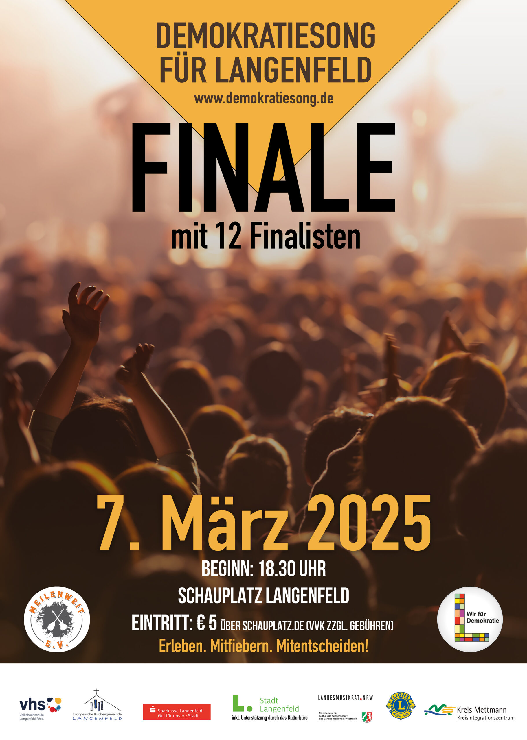 Das Finale des DemokratieSong-Contest finde am 7. März 2025 statt. Tickets gibt es unter den bekannten Vorverkaufsstellen der Stadthalle Langenfeld. Wir freuen uns viele von Euch zu sehen! Weitere Infos unter www.demokratiesong.de