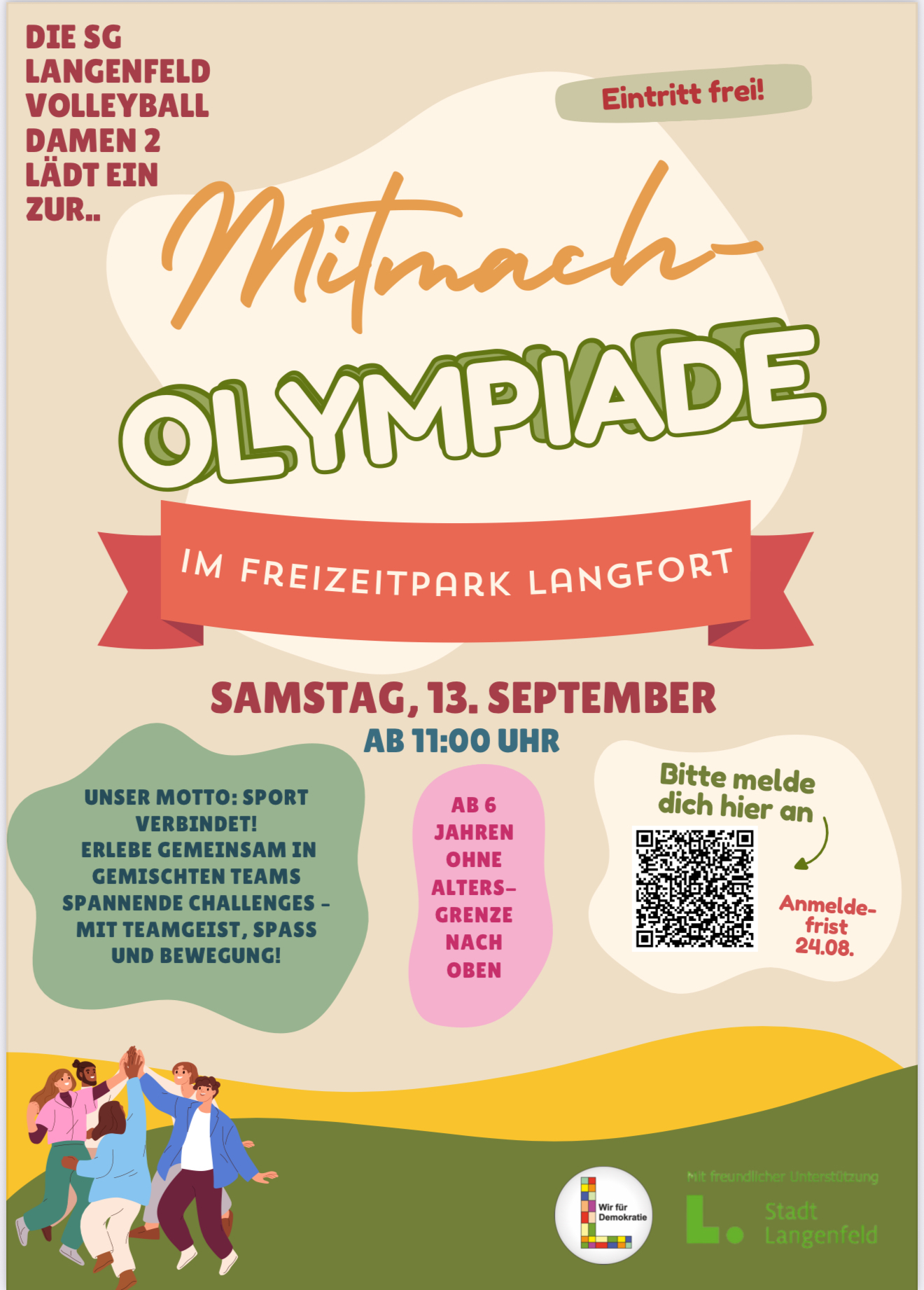 Wir, die 2. Volleyball-Damenmannschaft der SGL, veranstalten am 13. September eine Mitmach-Olympiade im Freizeitpark Langfort. Wir möchten Euch alle herzlich einladen, daran teilzunehmen! 😊 Die Idee: Menschen aus allen Altersgruppen und Hintergründen in gemischten Teams zusammenbringen und gemeinsam verschiedene Challenges bewältigen. Die Teilnehmenden erwarten verschiedene Stationen mit sportlichen, kreativen oder kniffligen Aufgaben, die im Team zu lösen sind. Dabei geht es ums Mitdenken, Zusammenarbeiten und sich gegenseitig unterstützen – ganz im Sinne von gelebter Demokratie und Gemeinschaft. Sportliche Vorerfahrung ist nicht notwendig. Ab 6 Jahren kann man teilnehmen, ohne Altersgrenze nach oben. Insbesondere Erwachsene wollen wir auch ermutigen teilzunehmen, denn