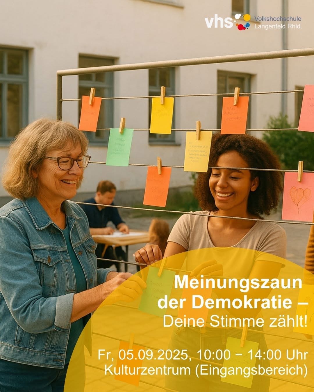 Der Meinungszaun der Demokratie – Langenfeld kommt zu Wort Am Freitag, 05. September, wird der Eingangsbereich des Kulturzentrums zum kreativen Marktplatz der Meinungen! Zwischen 10:00 und 14:00 Uhr laden wir Dich herzlich ein, bei unserem offenen MitmachAngebot zum Thema Demokratie dabei zu sein. Malen. Schreiben. Dichten. Setz ein Zeichen für Vielfalt, Zusammenhalt und Meinungsfreiheit – mit Farbe, Worten oder Poesie. Ob spontan oder mit Bedacht: Jede Stimme zählt! Deine Gedanken werden (ohne Namen) auf Karten festgehalten, laminiert und direkt am „Meinungszaun“ ausgestellt – sichtbar für alle, mitten in der Stadt. 📍 Wo? Vor dem Flügelsaal, Kulturzentrum Langenfeld 💡 Wie? Einfach
