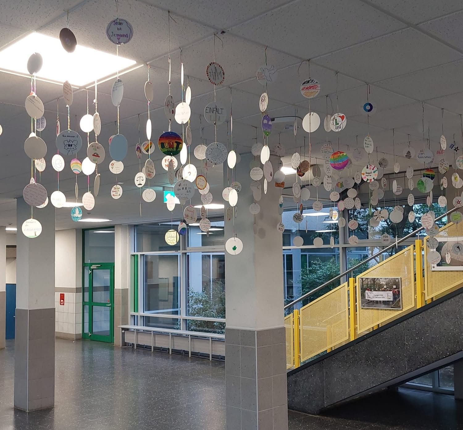 Das Konrad Adenauer Gymnasium hat unsere Wanderausstellung zum Anlass genommen, um sich nachhaltig mit dem Thema Demokratie auseinanderzusetzen. Mehrere hundert Kinder und Jugendliche haben ihre Gedanken aufgeschrieben und so ist ein wunderbares Mobile entstanden. Es hängt in der Eingangshalle für alle sichtbar!