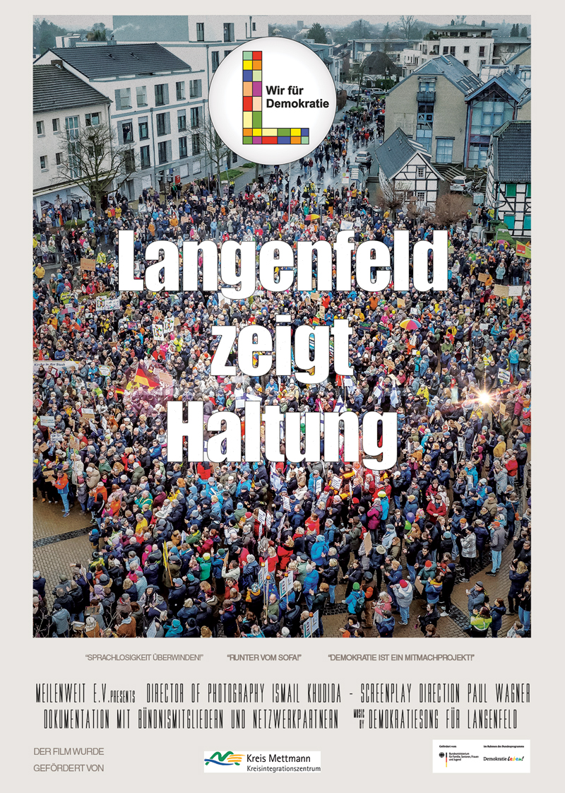 Am 14.9.2025, am Wahlsonntag, zeigt das Langenfelder Bündnis „Wir für Demokratie“ im Langenfelder Rex-Kino um 10:30 Uhr die Uraufführung des Films „Langenfeld zeigt Haltung“. Der Dokumentarfilm auf professionellem Niveau zeichnet Entstehung, Arbeitsweise, Wirkung und Vision des Langenfelder Bündnisses für Demokratie nach. -> TRAILER Idee Allerdings ist es kein Film „über“ das Bündnis. Stattdessen erzählen die Teilnehmenden selbst von ihrem Engagement. Auf sympathische Weise berichten sie, was sie antreibt, was sie bewegt und was sie inzwischen selbst in Bewegung gebracht haben. Dazu lässt vielfältiges und berührendes Archivmaterial die Aktivitäten des Bündnisses lebendig werden. Inhalt Der Film beginnt mit den Ereignissen rund