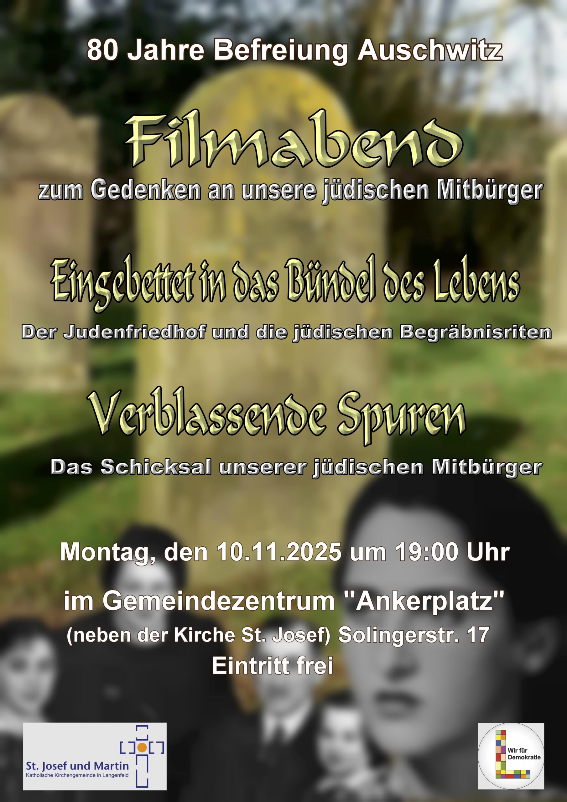 Mit der Pogromnacht am 9. November 1939 begann die millionenfache Massenvernichtung von Menschen jüdischen Glaubens und endete vor 80 Jahren mit der Befreiung von Auschwitz. Auch in Langenfeld brannte die Synagoge und eine gut integrierte jüdische Gemeinde in unserer Stadt wurde ausgelöscht. Mit dem Filmabend wollen wir an das damalige Geschehen und exemplarisch an das Schicksal unserer jüdischen Mitbürger erinnern. In einem weiteren Film erfahren wir durch einen Rabbiner mehr über die jüdischen Begräbnisrituale. Wir laden Sie herzlich zu diesem Abend des Erinnerns am 10.11.2025 um 19:00 Uhr in den Ankerplatz an St. Josef ein. Anschließend ist Gelegenheit zum Gedankenaustausch